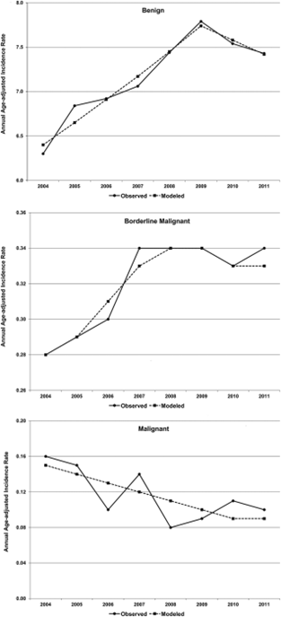 ... Statistically significant increases in the annual AAIRs from 2004 to 2011 were apparent for benign and borderline malignant tumors, whereas AAIRs for malignant tumors significantly decreased....
